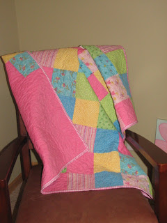 I finished E's quilt!!!! I love how the binding pulls it all together and without even realizing it - it matches her crib bedding! She is thrilled with it too... Can you tell?